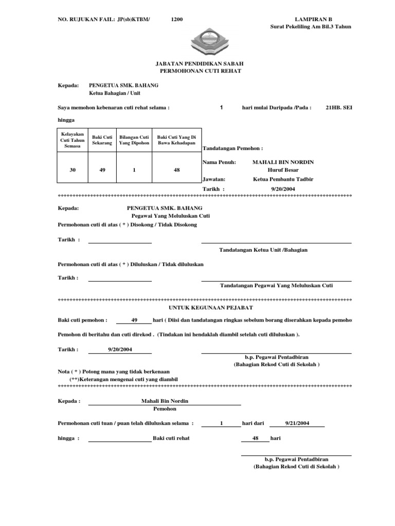 Borang Cuti Rehat Khas Guru Pdf